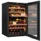 Ce modèle est équipé d'une porte vitrée réversible triple-vitrage gris en verre trempé traité anti-UV. La porte avec encadrement noir est dépourvue de poignée. L'ouverture s'effectue au moyen d'un système "push-pull" électronique, nécessitant simplement une légère pression sur la porte. Le design de la cave est renforcé par un éclairage intérieur à LED modulable en couleur (blanc froid, blanc chaud et ambré) et en intensité (25%, 50%, 75%, 100%), commandé par interrupteur.