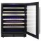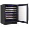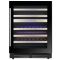 Cette cave est équipée d'une porte vitrée réversible (triple vitrage traité anti-UV), d'un cadre de porte full glass noir, de clayettes coulissantes en bois à fronton inox, ainsi qu'un éclairage intérieur à LED.