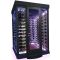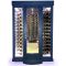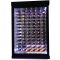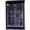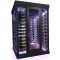 Un coté est équipé de 9 grandes clayettes plexiglas transparentes. L'autre coté est équipé de 6 supports suspendus chromés de 13 bouteilles et le Fond de 3 supports suspendus de 10 bouteilles. Capacité 250 bouteilles