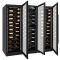 Ce combiné enchassable de 3 caves à vin mono-température de service offre 4 zones de températures : celles de gauche et de droite réglables de 5 à 22°C, en haut au milieu de 5 à 12°C et en bas au milieu de 12 à 20°C. Il est équipé de portes vitrées traitées anti-UV, avec un encadrement noir full glass et un éclairage intérieur à LED vertical sur toute la hauteur.