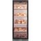 L'éclairage LED latéral rose pale sur toute la hauteur de la cave se reflète sur l'habillage intérieur en inox poli miroir, afin de mettre encore plus en valeur les produits exposés, stockés sur 4 clayettes en inox.